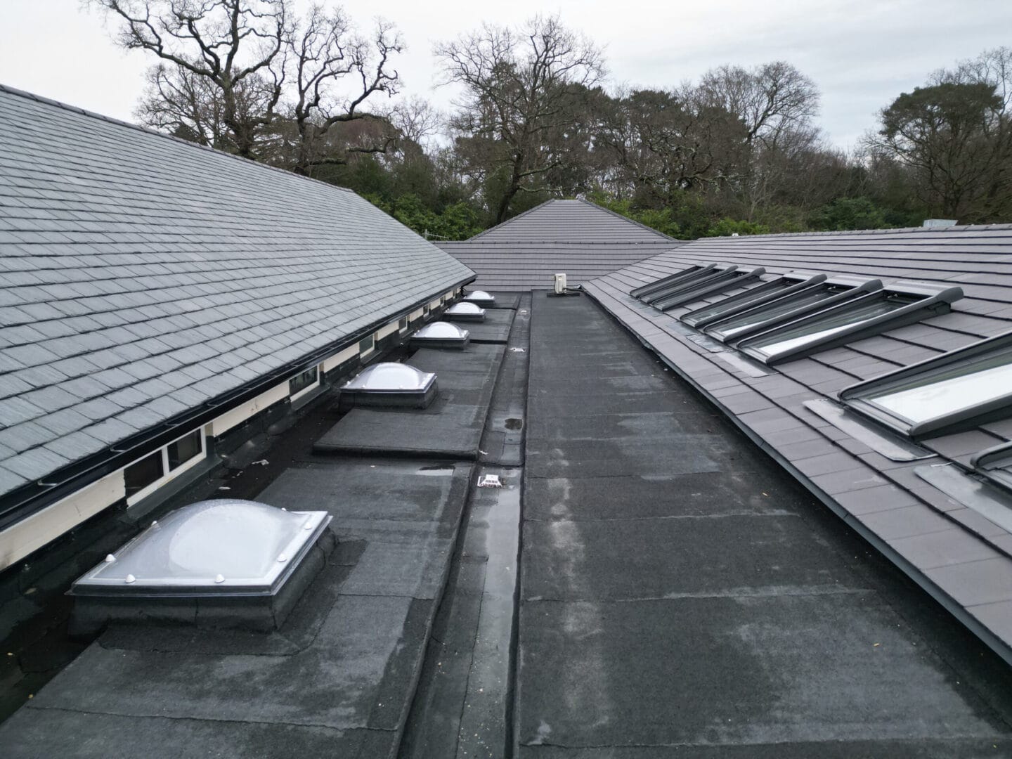 For the flat roofs we used a Soprema built up felt system, as well as liquid coating in areas. For the pitched elements we stripped all existing slates and replaced with new. We also removed and replaced rooflights throughout.