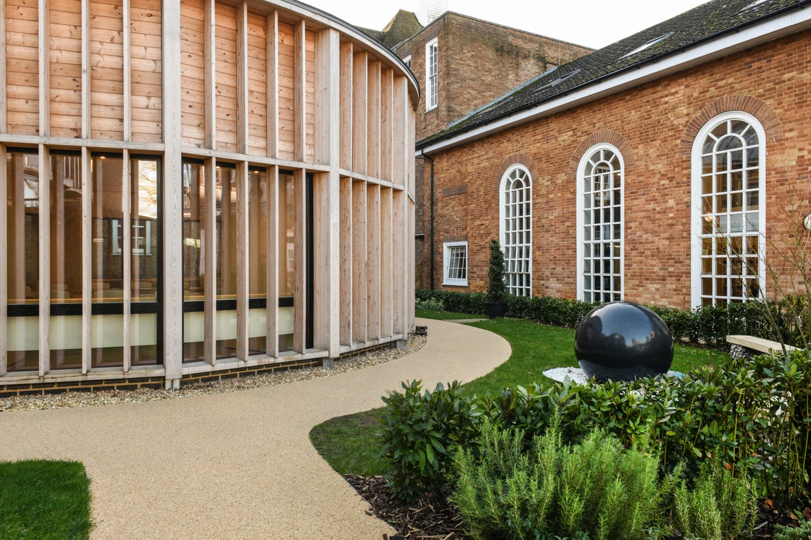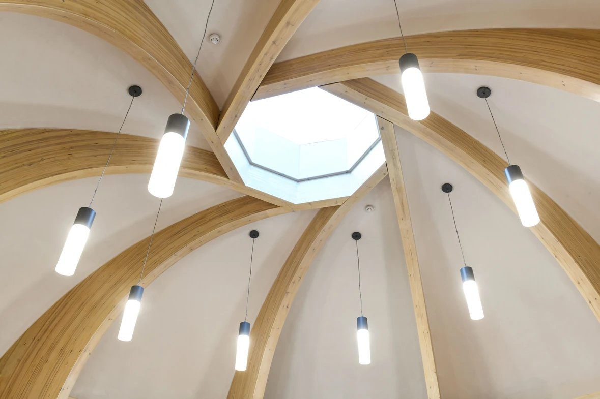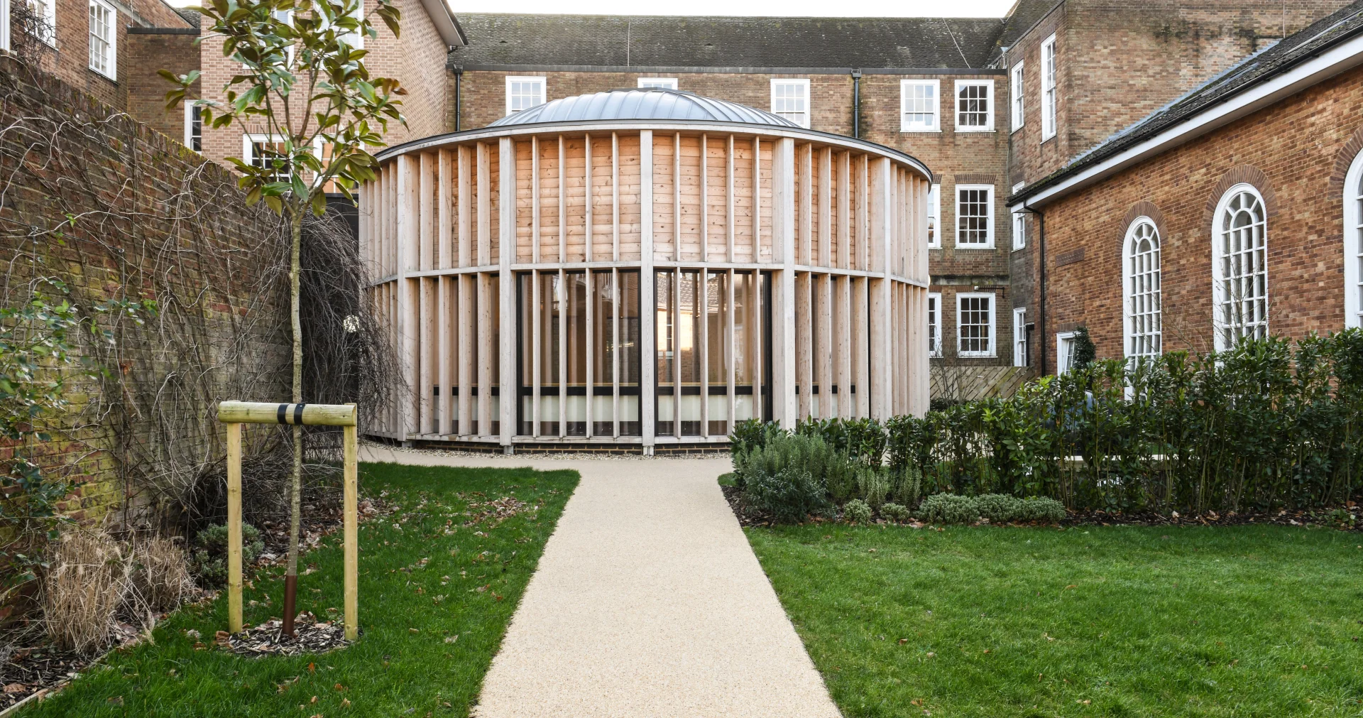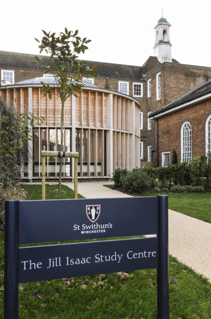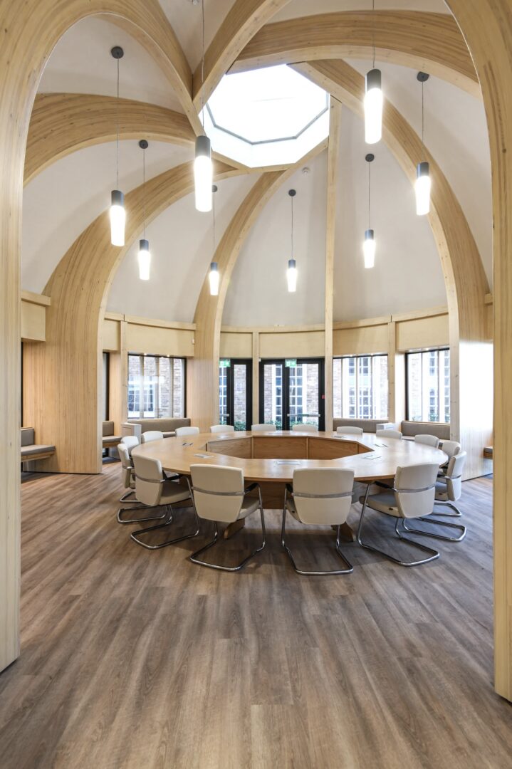 The Jill Isaac Building at St Swithun’s School in Winchester is a contemporary extension offering additional flexible space for private study and group discussion. The circular building is formed using a curved glulam frame structure with a GRP dome clad in zinc roofing. A large central rooflight, formed using the offset geometry of the timber frame floods the area with natural light, creating a stunning and sustainable building.